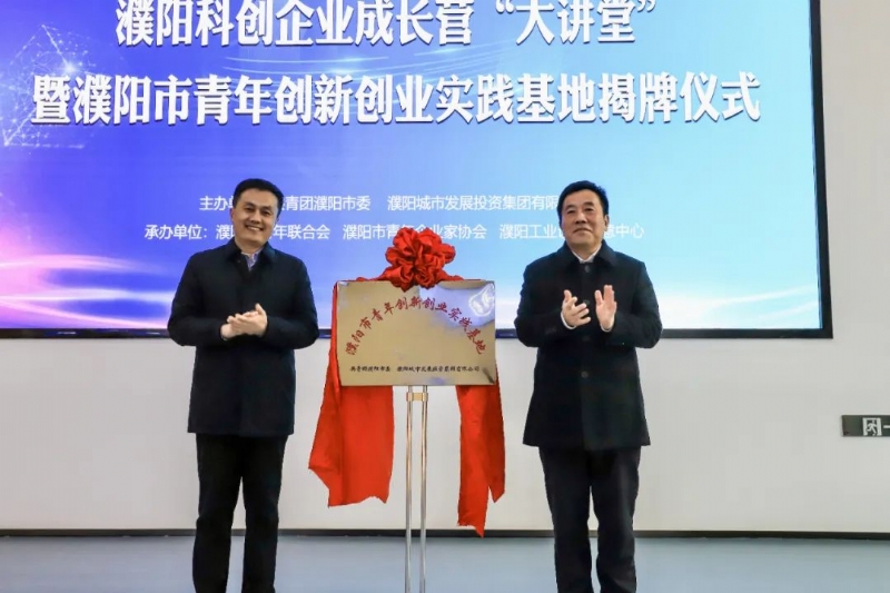 团市委副书记闫兆敏、濮阳城发投集团总经理闫进轩为濮阳市青年创新创业实践基地揭牌。